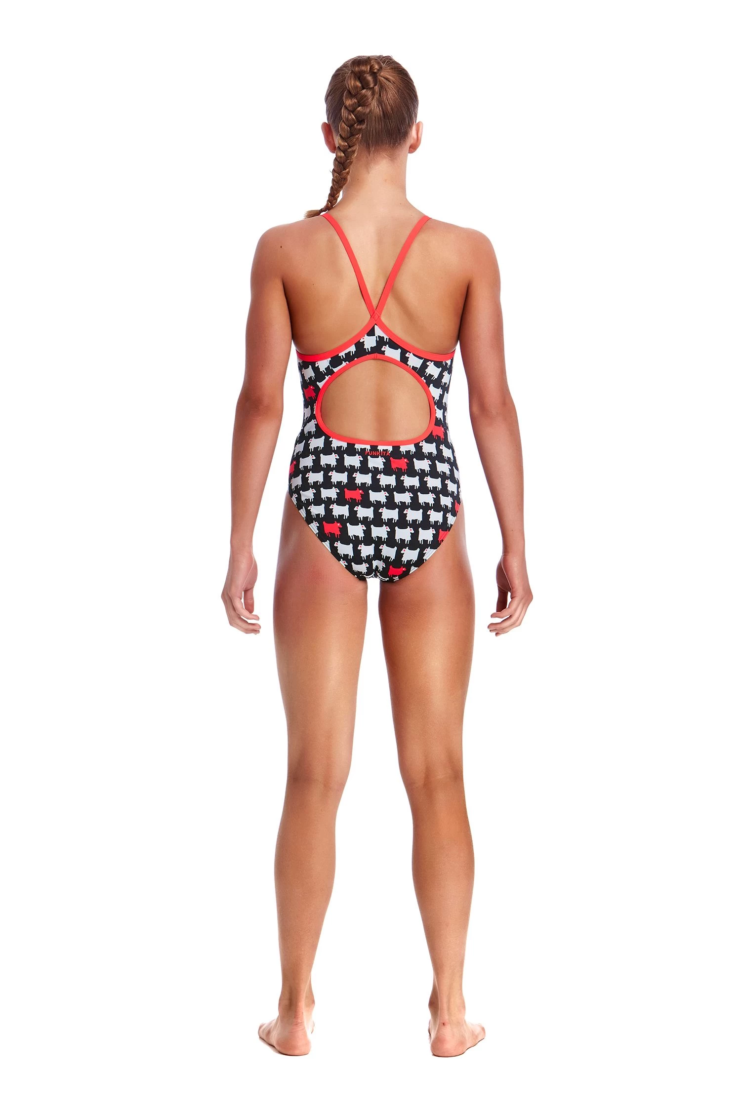 Classic training style with signature diamond back strap finish and modest rear coverage is perfect for lap sessions. Features a circular cut-out back. With front lining and Funkita embroidery, this easy style says it all. Available in girls’ sizes 8 – 14.