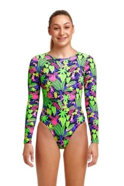 - Full coverage for the girl who wants complete sun protection on their upper body with full arms, high back and high neck one piece.