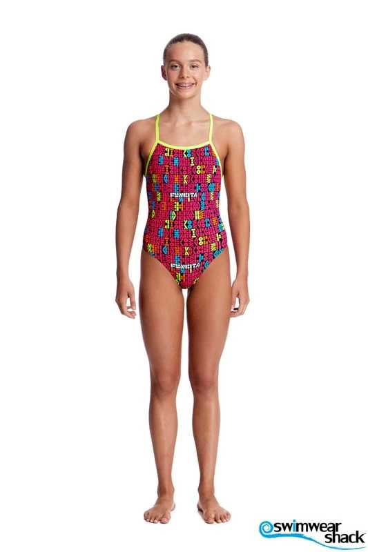 You’ll be sure to get noticed on pool deck in our strappiest one piece yet! Single strap binds that criss cross down your back with a moderately high cut leg. Available in sizes 8-14.