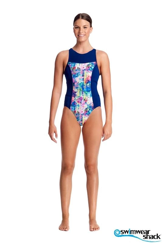A high back, high neck one piece with a mesh panel across the chest and zip fastening to secure at back. Panelled to create a strong silhouette and lined with powermesh for an extra supportive fit. Moderate rear coverage. Available in sizes 8 – 16.