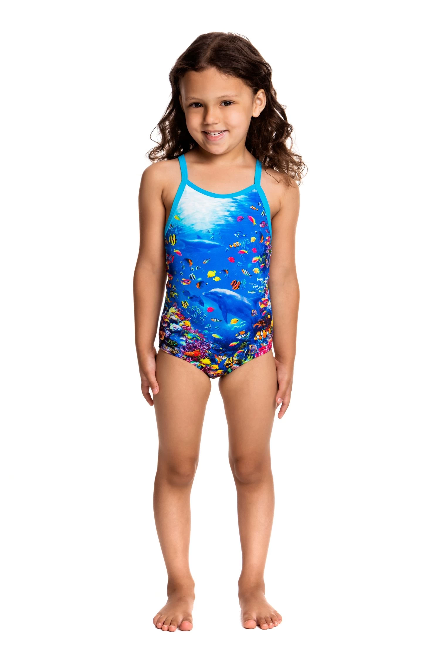 With full back coverage and a racer strap finish, this simple style is easy to put on and take off. Features a low leg, single strap bind with Funkita embroidered logo and full front lining. Available in sizes 1 – 6.Â