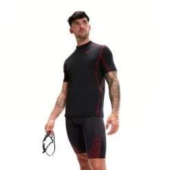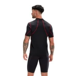 Performance swimwear for the outdoors. Our sleek black Short Sleeve Rash Top is designed to protect you against the elements outdoors and includes UPF40+ fabric sun protection. Ideal for use in and out of the water, the snug-fitting, pull-on style includes flatlocked seams for a comfortable fit against the body, whilst the striking red detailing has a tech-inspired aesthetic. Designed to be durable and better for the environment, the top is made from our new ECO Endurance+ fabric, which is 100% chlorine resistant, quick-drying, and made from 50% recycled materials.