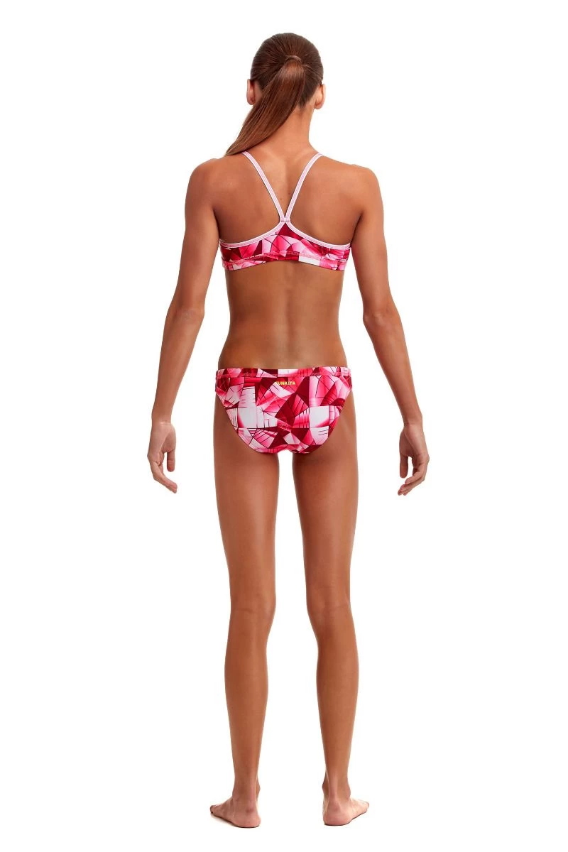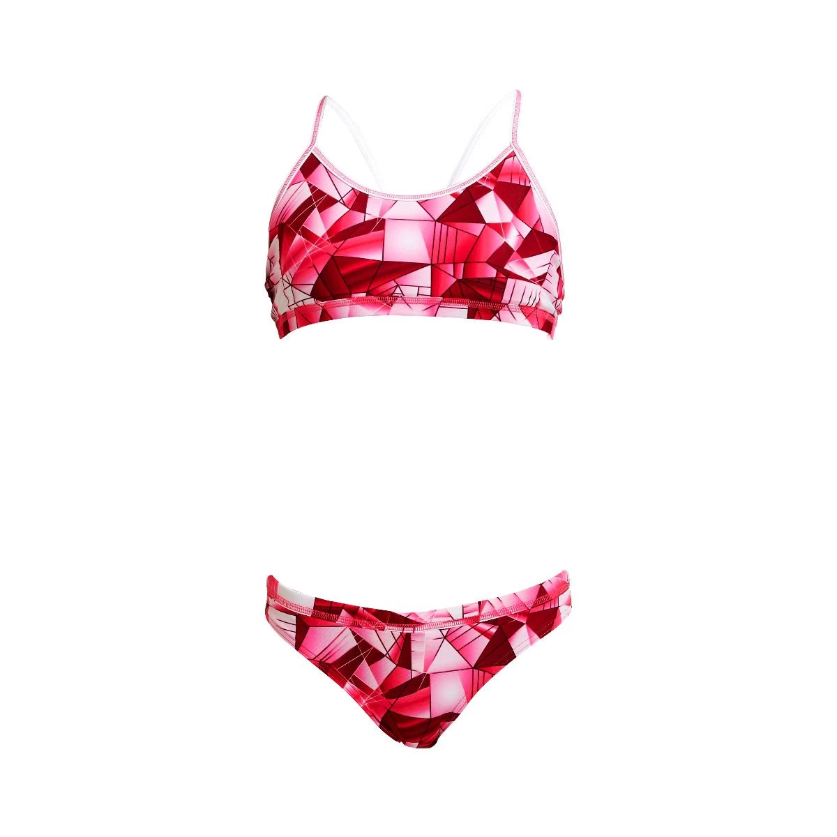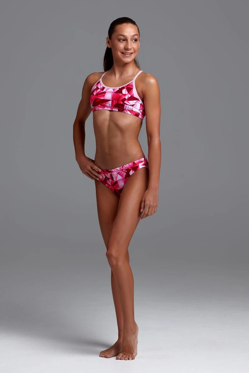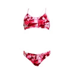 A firm fitting crop top and hipster brief suited to the sporty girl. It’s a secure fit with underbust and waist elastic and drawcord in the brief. Features a single shoulder bind strap finish.
