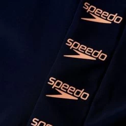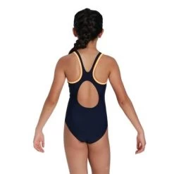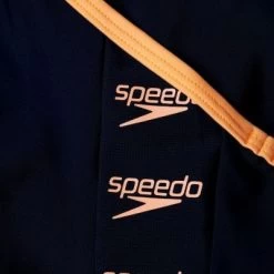 Iconic Speedo style. This sleek navy Muscleback suit features an eye-catching orange splice of our iconic print down its side. Great for longer swim sessions, the muscleback style enables your child to achieve a full range of motion during their swim. Made from our soft Endurance10 fabric, it provides higher chlorine resistance than standard swimwear fabrics and fits like new for longer with CREORA® HighClo™.