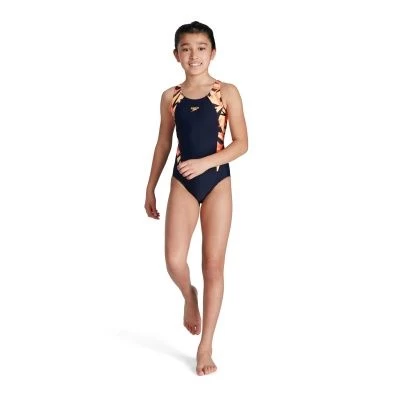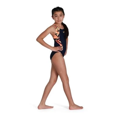 Iconic Speedo Style. This sporty navy Muscleback swimsuit features a curved splice of our new ‘shattered’ Boom logo print in shades of red and orange. Great for longer swim sessions, the muscleback style enables your child to achieve a full range of motion during their swim. Made from our soft Endurance10 fabric, it provides higher chlorine resistance than standard swimwear fabrics and fits like new for longer with CREORA® HighClo™.