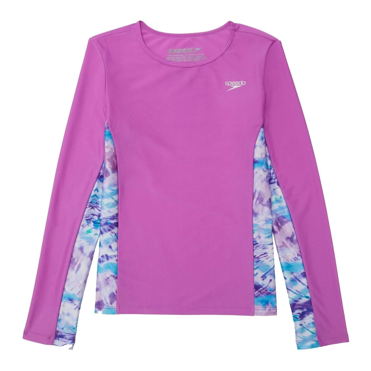 Prepare young swimmers for fun in the water with a durable rashguard. This fitted top features printed long sleeves and side panels. UPF rated, so she can splash all day.