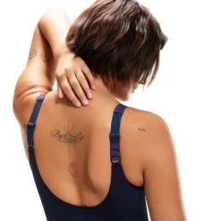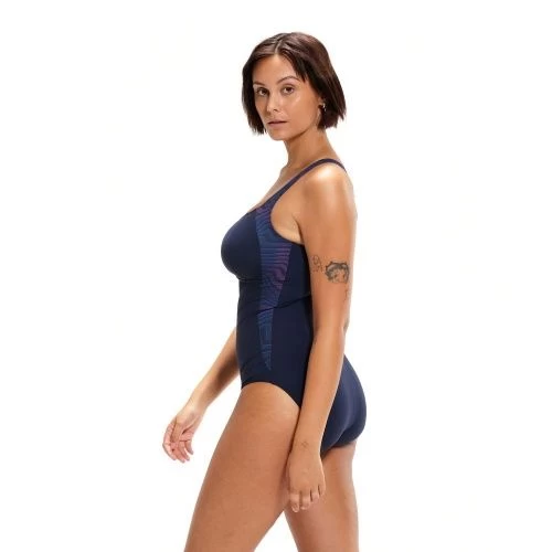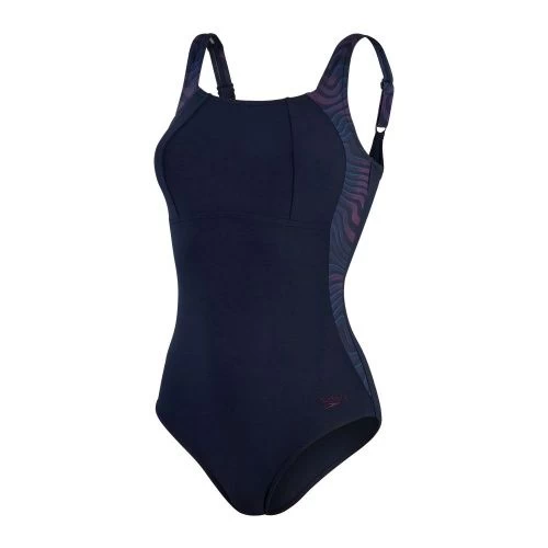 Enhances, flatters and feels good all over. The sporty-look navy LunaLustre swimsuit features a squared neckline and a flattering scooped back. A swirling sand-ripple print runs from the strap to the waist, creating a contouring effect that narrows the waist. Offering medium bust support, the hidden bust shelf liner and adjustable straps ensure a great fit during your workout, while the all-over shaping fabric provides support where you need it. Made from 100% pre-consumer waste fabric, our soft new ECO SHAPE COMPREX ULTRA fabric teams the best in shapewear innovation with the latest swimwear technology. Perfect for your regular workout, it includes LYCRA® XTRA LIFE™, which is ultra-chlorine resistant and lasts twice as long as standard swimwear fabrics.