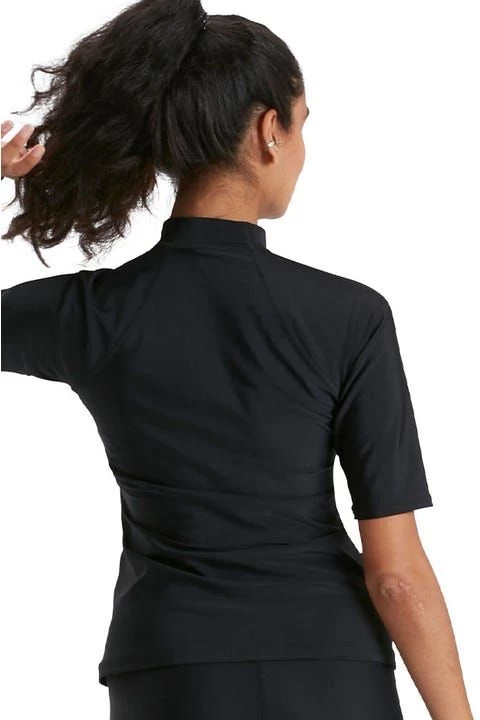Stylish sun protection swimwear. Come rain or shine, this relaxed-fit Short Sleeve Swim Tee from our Essentials range has you covered and can be worn outdoors or in the pool. Offering fabric sun protection of UPF40+ and a comfy, relaxed fit, it’s ideal for active beach days spent in and out of the water. Our ECO Endurance 10 fabric offers superb colour performance, so you can enjoy the deep black colour for longer. Offering higher chlorine resistance than standard swimwear fabrics, the swim tee fits like new for longer with CREORA® HighClo™ and is made from 100% recycled materials, so it is better for the environment too.